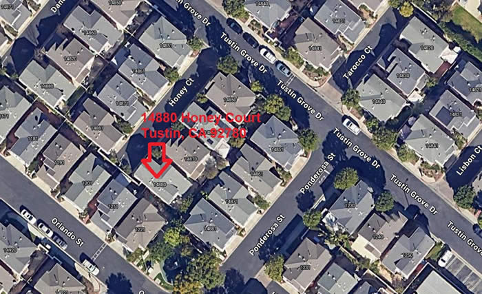turn left on Newport Ave., turn left on Tustin Grove Dr.(gate), left on Honey Court, see aerial view below.
